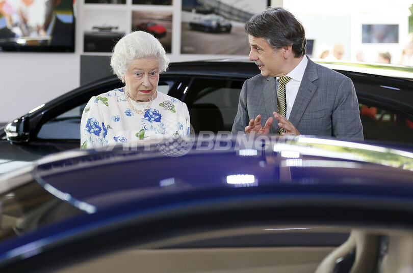 写真は宮殿の庭に展示された英国車「ジャガー」を見るエリザベス女王(2013年7月11日撮影)。(c)AFP/Stefan Wermuth