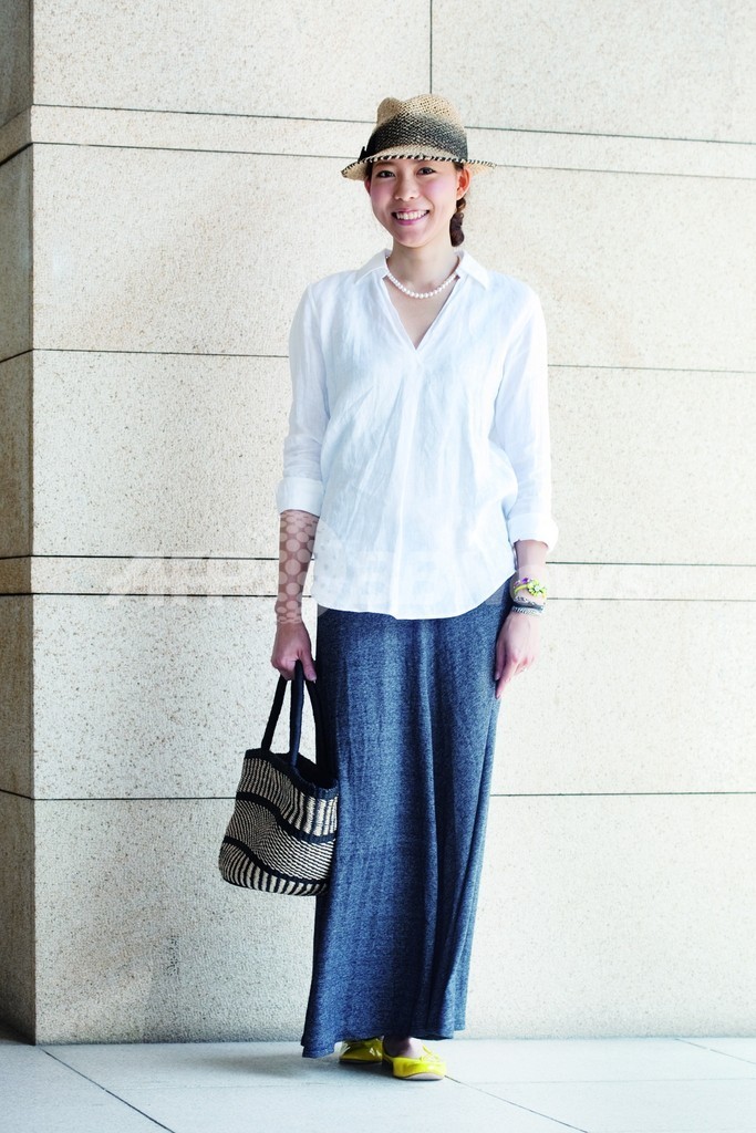 「クリーンな白を基調にした肩肘を張らないコーディネート。シューズやバッグで色を加え、パールのネックレスで上品にまとめるのがお薦めです。リネンやラフィアなど夏素材のアイテムや、シーズンを問わず取り入れられるビジューアクセが充実しています」(プレス 水口絢詠さん)