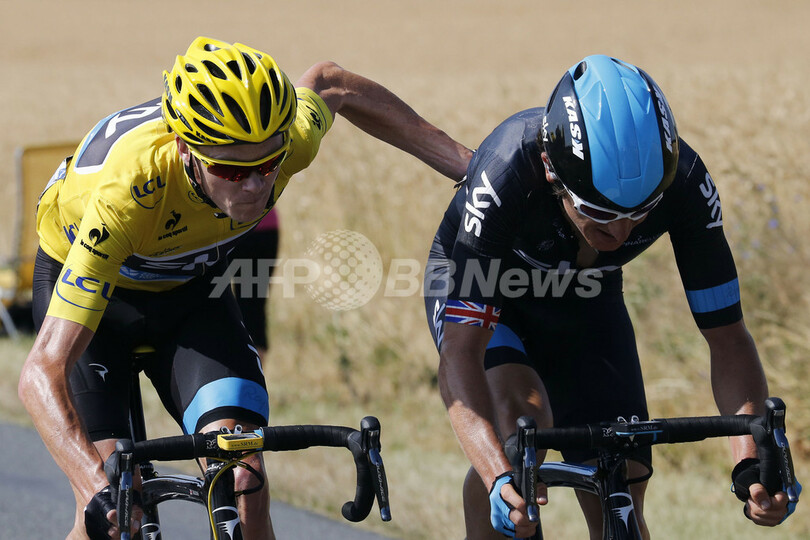 チームメイト、ジェラント・トーマス(Geraint Thomas、右)の背中を押すスカイ(Sky Pro Cycling)のクリス・フルーム(Chris Froome、2013年7月12日撮影)。(c)AFP/JOEL SAGET