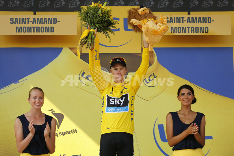 総合首位を守り、表彰台でギャラリーの声援に応えるスカイ(Sky Pro Cycling)のクリス・フルーム(Chris Froome、中央、2013年7月12日撮影)。(c)AFP/JEFF PACHOUD