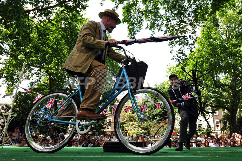 【7月14日 AFP】ロンドン(London)市内で13日、1920年代から50年代の英国ファッションや風習を独自に振り返る毎年恒例のイベント「チャップ・オリンピアード(Chap Olympiad)」が開催された。英国紳士になりきった男性参加者らは、傘を剣の代わりにして戦うゲームなどに興じたり、パイプをくゆらせたりした。女性参加者らもレトロな帽子やドレス姿でイベントに参加した。(c)AFP