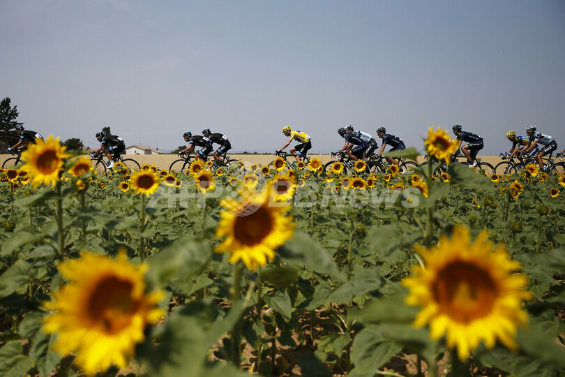 ひまわり畑の脇でレースに臨む選手(2013年7月14日撮影)。(c)AFP/JEFF PACHOUD