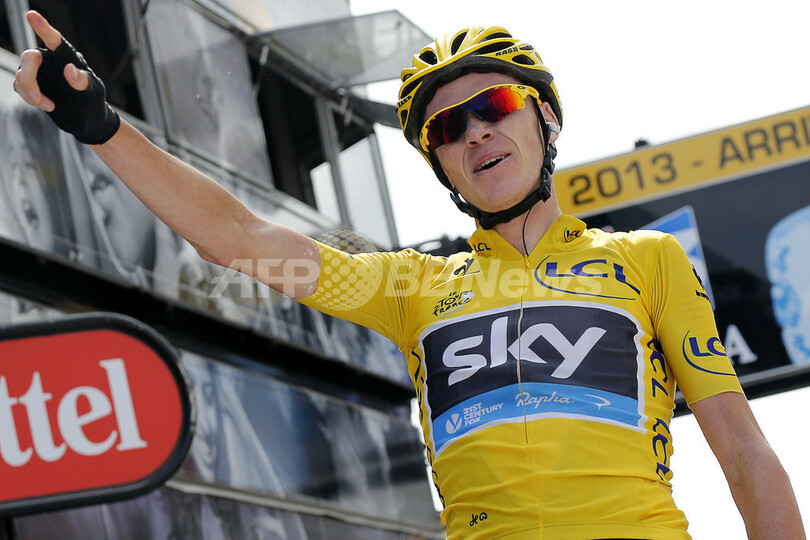 ゴール手前で勝利を喜ぶクリス・フルーム(2013年7月14日撮影)。(c)AFP/JEFF PACHOUD