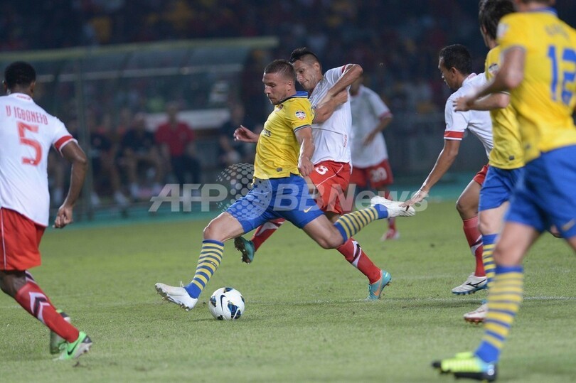 追加点となるシュートを放つアーセナルのルーカス・ポドルスキー(Lukas Podolski、中央、2013年7月14日撮影)。(c)AFP/ADEK BERRY