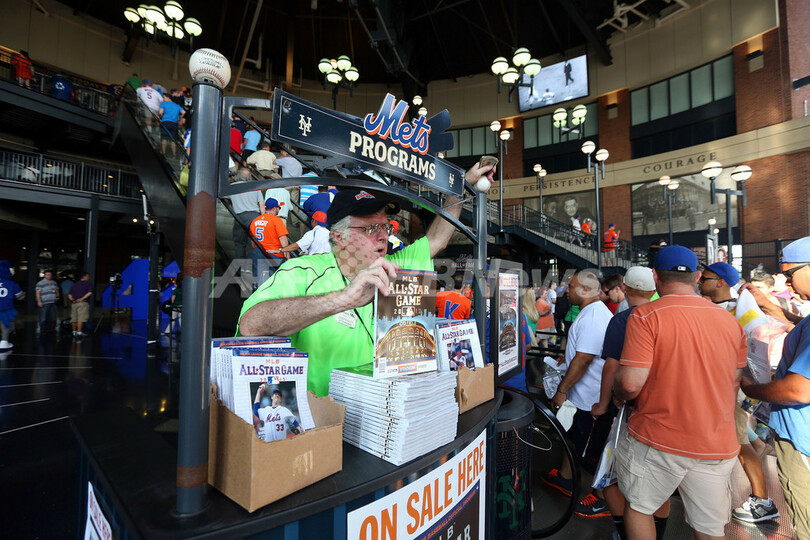 球場内のプログラム販売員(2013年7月15日撮影)。(c)AFP/Getty Images/Bruce Bennett