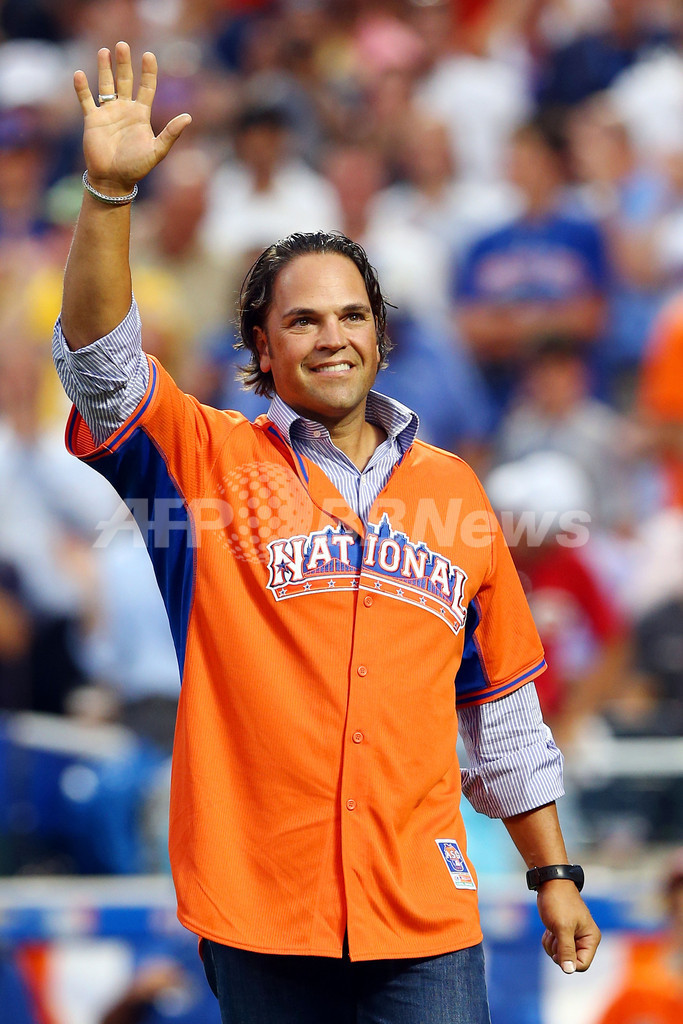 スタジアムに登場し、歓声に応えるマイク・ピアザ(Mike Piazza)氏(2013年7月15日撮影)。(c)AFP/Getty Images/Elsa
