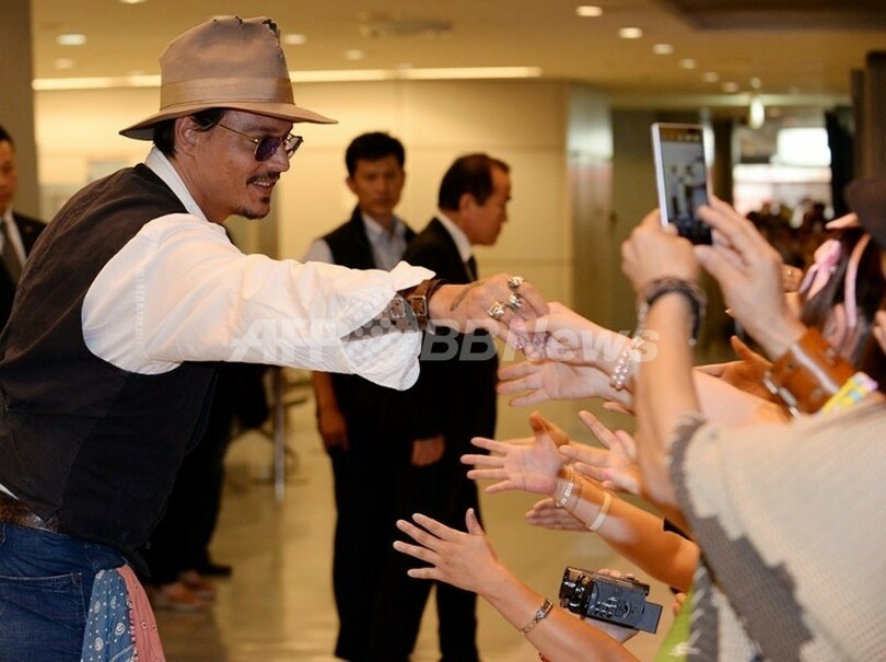 【7月17日 AFP】米俳優ジョニー・デップ(Johnny Depp)が16日、最新主演映画『ローン・レンジャー(The Lone Ranger)』のプロモーションのために来日し、成田国際空港(Narita International Airport)で大勢のファンに出迎えられた。同作品の日本公開は8月2日。(c)AFP