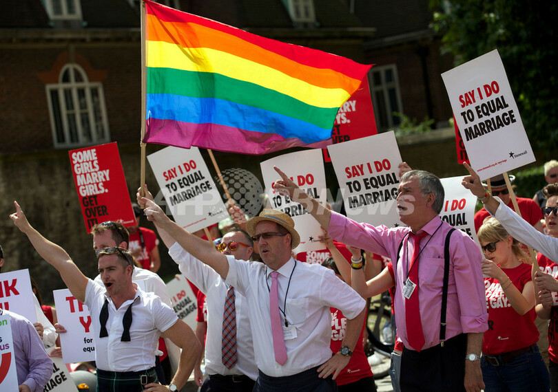 【7月17日 AFP】英国議会は16日、イングランドとウェールズでの同性婚を認める法案を可決した。週内にエリザベス女王(Queen Elizabeth II)の裁可を経て成立する見通しで、来年にも初の同性婚カップルが誕生する。