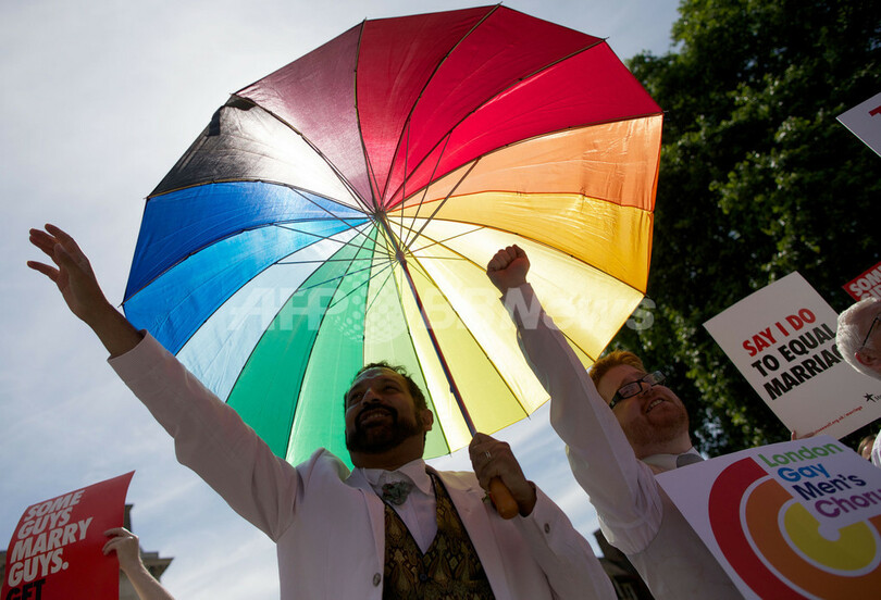 【7月17日 AFP】英国議会は16日、イングランドとウェールズでの同性婚を認める法案を可決した。週内にエリザベス女王(Queen Elizabeth II)の裁可を経て成立する見通しで、来年にも初の同性婚カップルが誕生する。