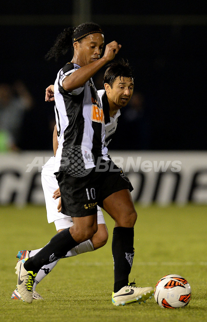 オリンピア・アスンシオンのエドゥアルド・アランダ(Eduardo Aranda、奥)とボールを競るアトレチコ・ミネイロのロナウジーニョ(Ronaldinho、2013年7月17日撮影)。(c)AFP/PABLO PORCIUNCULA