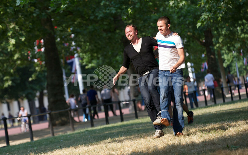 写真は、ロンドン(London)中心部のセントジェームズ・パーク(St James' Park)で二人三脚をして遊ぶ男性たち(2013年7月17日撮影)。(c)AFP/ANDREW COWIE