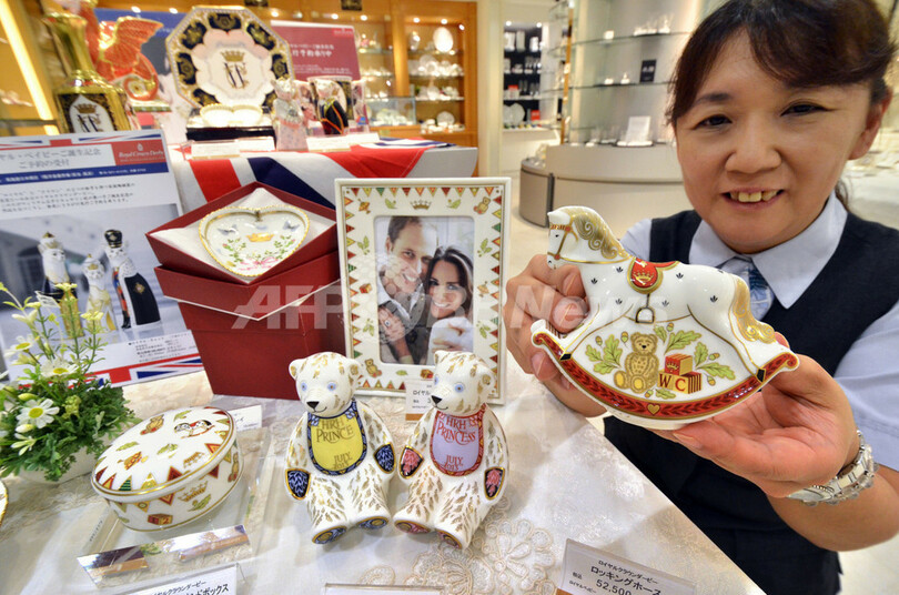 【7月18日 AFP】百貨店の高島屋(Takashimaya)日本橋店では、英国のウィリアム王子(Prince William)とキャサリン妃(Catherine,Duchess of Cambridge)の間にまもなく第1子が誕生することを記念し、英国の老舗陶磁器ブランド「ロイヤルクラウンダービー(Royal Crown Derby)」の食器や人形などのロイヤルベビーグッズを販売している。人気はロイヤルベビーの名前が入ったエプロンをつけた「ロイヤルベビーテディベア」。ロイヤルベビーが男の子の場合は青、女の子の場合は赤の人形となり、注文主の元には9月に届く。(c)AFP