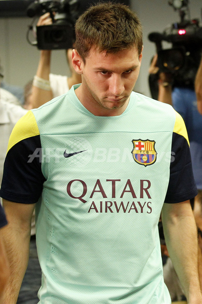 記者会見場を後にするFCバルセロナのリオネル・メッシ(Lionel Messi、2013年7月19日撮影)。(c)AFP/QUIQUE GARCIA