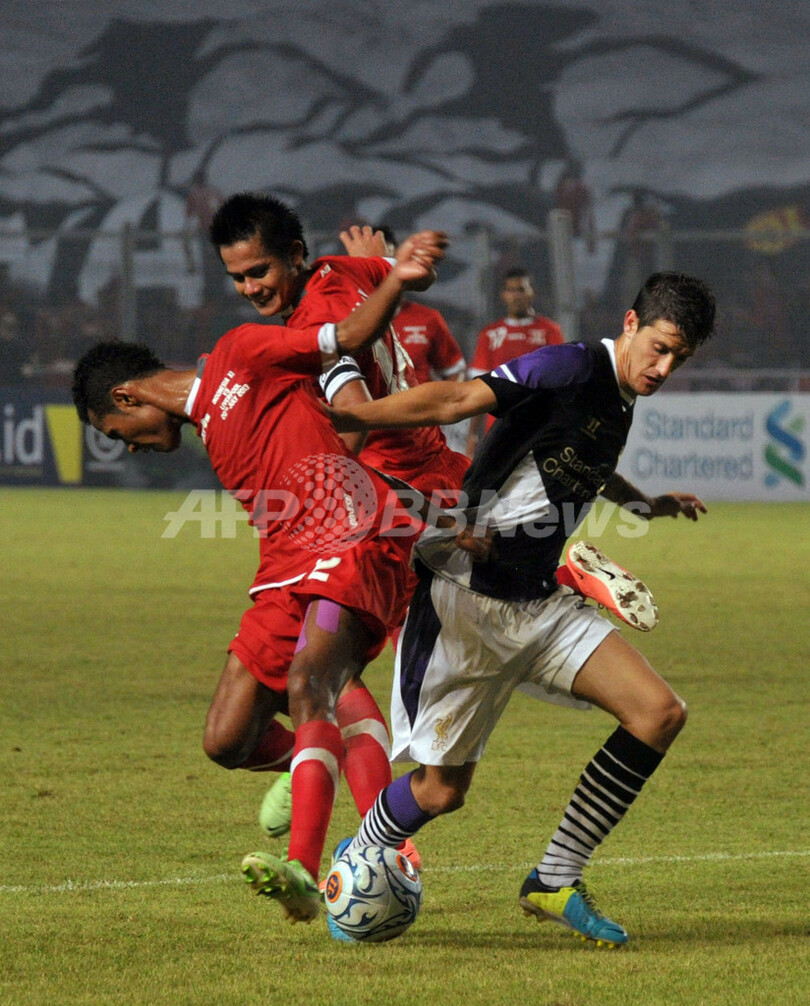 インドネシア選抜の選手とボールを競るリバプールのルイス・アルベルト(Luis Alberto Romero、右、2013年7月14日撮影)。(c)AFP/Bay ISMOYO