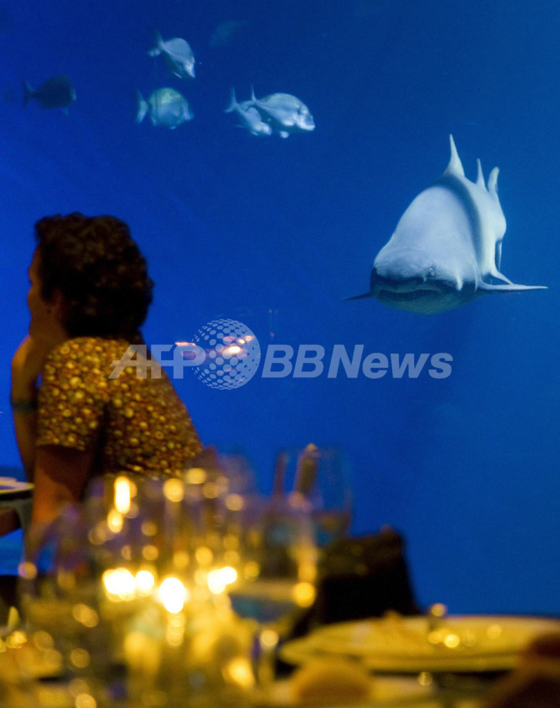 【7月20日 AFP】スペインのパルマデマジョルカ(Palma de Mallorca)にあるパルマ水族館(Palma Aquarium)で、欧州域内で最も水深のあるサメの水槽「ビッグ・ブルー(Big Blue)」の前で、ディナーを楽しむ人たち。(c)AFP
