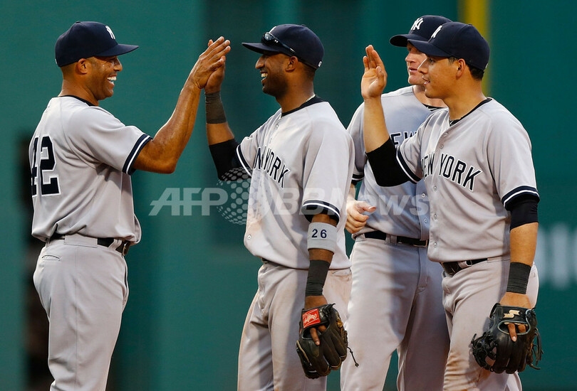 チームメイトと勝利を喜ぶニューヨーク・ヤンキースのマリアーノ・リベラ(Mariano Rivera、2013年7月20日撮影)。(c)AFP/Getty Images/Jared Wickerham