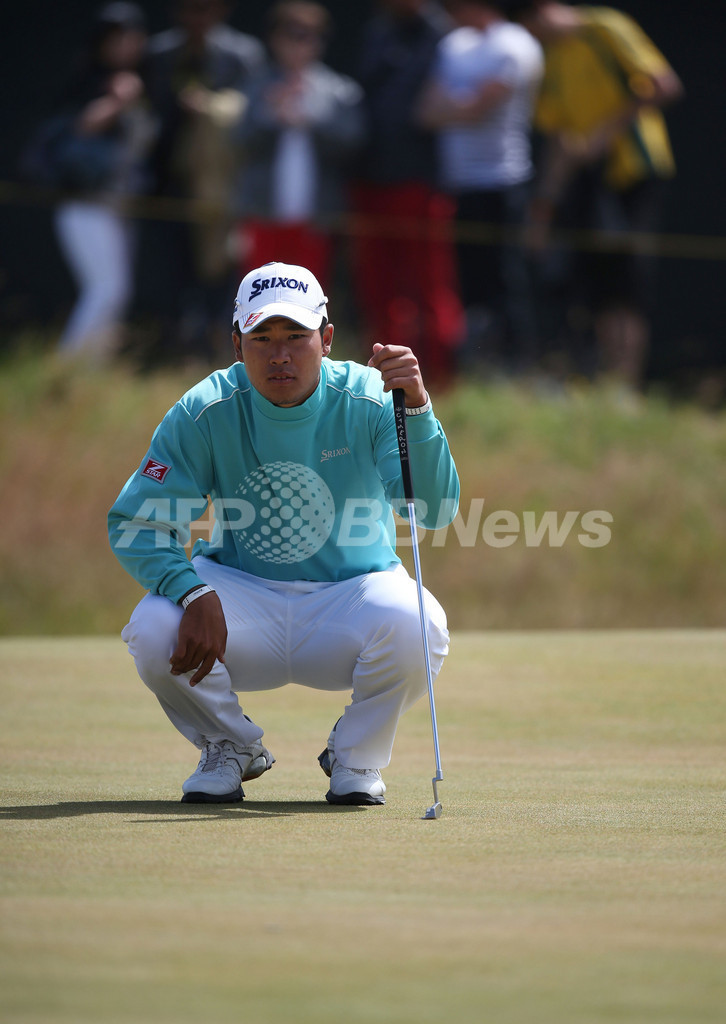 1番ホールのグリーン上でパットのラインを読む松山英樹(2013年7月20日撮影)。(c)AFP/ADRIAN DENNIS