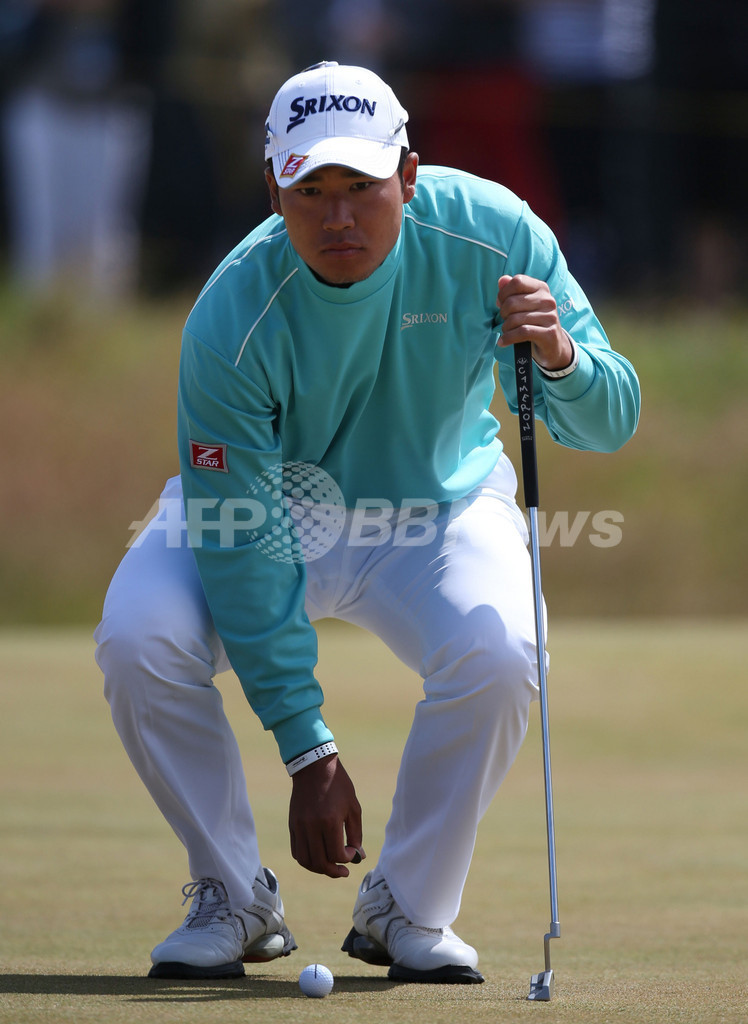 1番ホールのグリーン上でパットのラインを読む松山英樹(2013年7月20日撮影)。(c)AFP/ADRIAN DENNIS