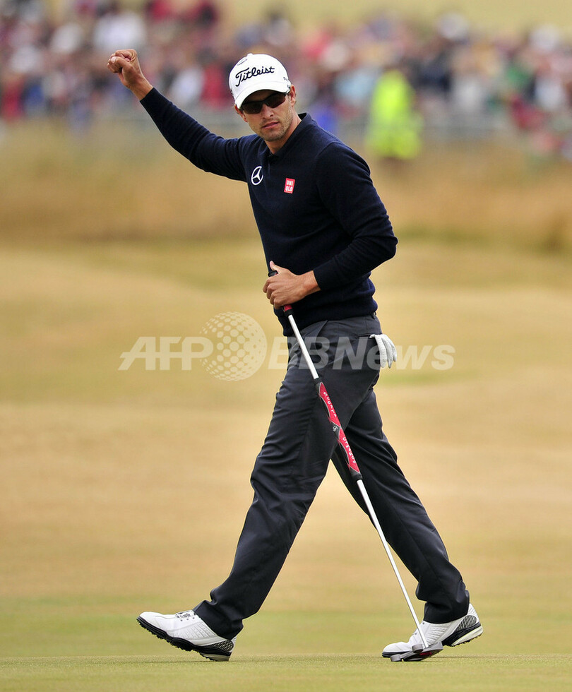 ラウンドを終え、ギャラリーの声援に応えるアダム・スコット(Adam Scott、2013年7月21日撮影)。(c)AFP/GLYN KIRK