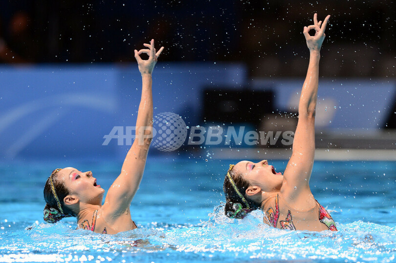 【7月22日 AFP】第15回世界水泳選手権(15th FINA World Championships)は21日、スペイン・バルセロナ(Barcelona)でシンクロナイズドスイミングのデュエット・テクニカルルーティン(TR)が行われ、ロシアのスベトラナ・ロマシナ(Svetlana Romashina)/スベトラナ・コレスニチェンコ(Svetlana Kolesnichenko)組が優勝した。(c)AFP