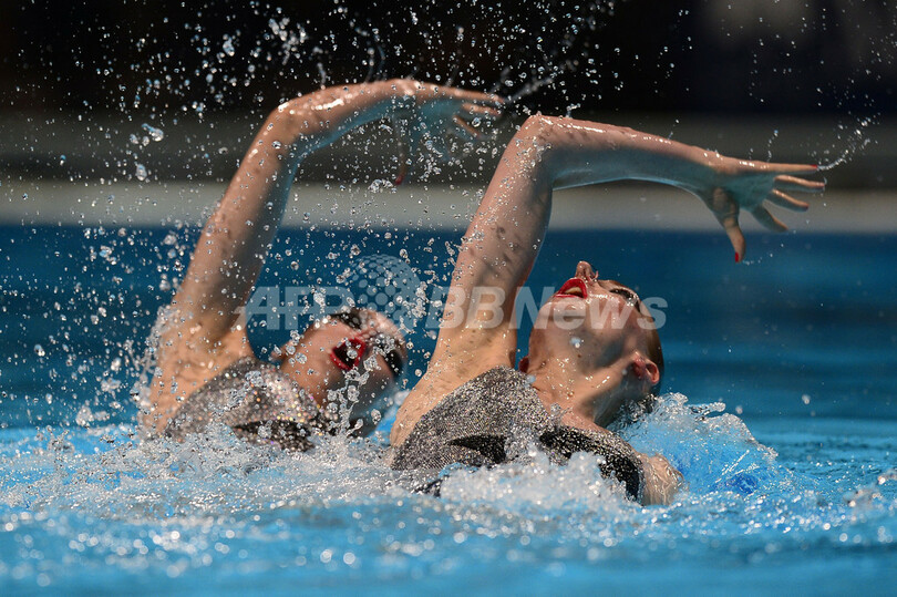 【7月22日 AFP】第15回世界水泳選手権(15th FINA World Championships)は21日、スペイン・バルセロナ(Barcelona)でシンクロナイズドスイミングのデュエット・テクニカルルーティン(TR)が行われ、ロシアのスベトラナ・ロマシナ(Svetlana Romashina)/スベトラナ・コレスニチェンコ(Svetlana Kolesnichenko)組が優勝した。(c)AFP