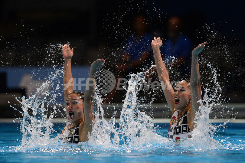 デュエットTR決勝の演技に臨む足立夢実(Yumi Adachi)/乾友紀子(Yukiko Inui)組(2013年7月21日撮影)。(c)AFP/JAVIER SORIANO