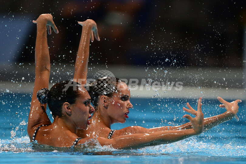 【7月22日 AFP】第15回世界水泳選手権(15th FINA World Championships)は21日、スペイン・バルセロナ(Barcelona)でシンクロナイズドスイミングのデュエット・テクニカルルーティン(TR)が行われ、ロシアのスベトラナ・ロマシナ(Svetlana Romashina)/スベトラナ・コレスニチェンコ(Svetlana Kolesnichenko)組が優勝した。(c)AFP