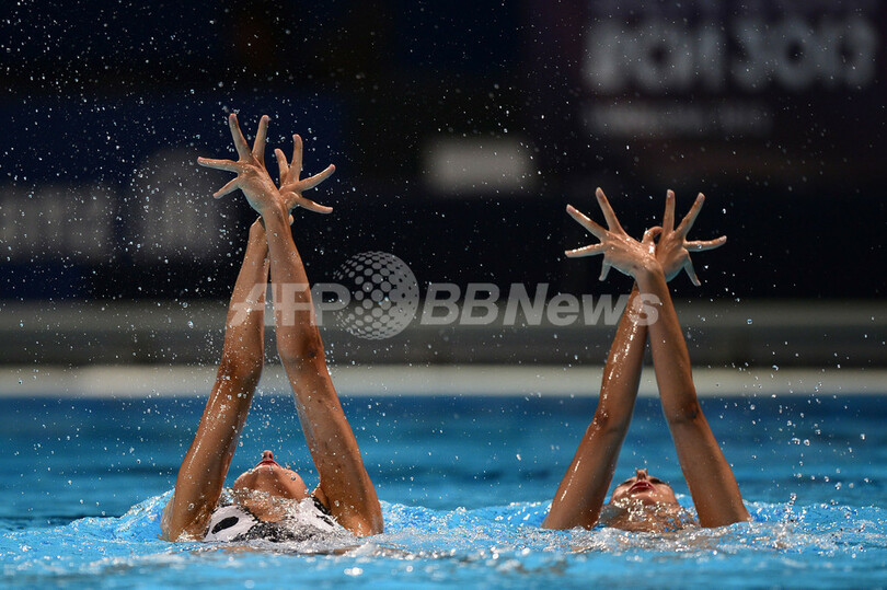 【7月22日 AFP】第15回世界水泳選手権(15th FINA World Championships)は21日、スペイン・バルセロナ(Barcelona)でシンクロナイズドスイミングのデュエット・テクニカルルーティン(TR)が行われ、ロシアのスベトラナ・ロマシナ(Svetlana Romashina)/スベトラナ・コレスニチェンコ(Svetlana Kolesnichenko)組が優勝した。(c)AFP
