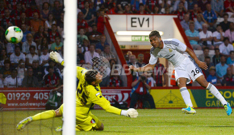 ボーンマスのGKダリル・フラハーヴァン(Darryl Flahavan、左)を破り、シュートを決めるカゼミーロ(Casemiro、2013年7月21日撮影)。(c)AFP/BEN STANSALL