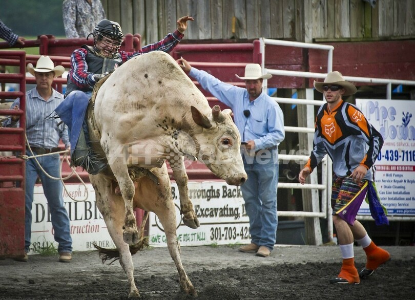 【7月22日 AFP】米メリーランド(Maryland)州ユニオンブリッジ(Union Bridge)の牧場で20日、「野獣の闘い(Battle of the Beast)」と題されたロデオ大会が開催され、荒れ狂う牛たちを悪戦苦闘しながら乗りこなすカウボーイたちの姿が見られた。プロのロデオ競技は米国で、観戦スポーツの中でも最も危険で、最も人気が急上昇している競技の一つとなっている。(c)AFP