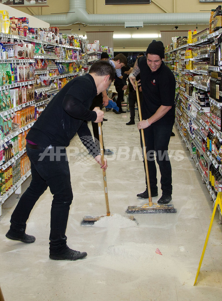 写真はウェリントン市内のスーパーマーケットで、地震で商品が崩れ落ちるなどした店内を清掃する店員ら(2013年7月21日撮影)。(c)AFP/ MARTY MELVILLE
