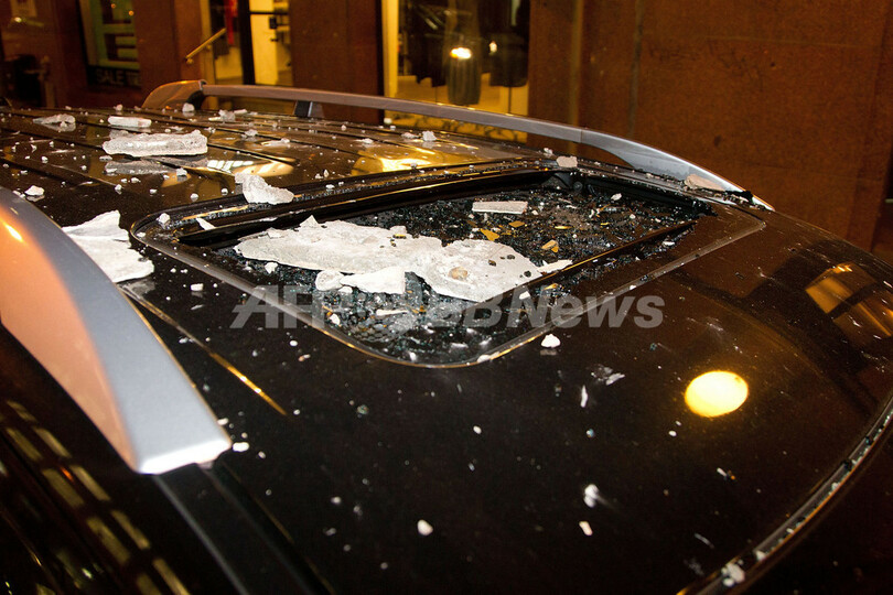 写真はウェリントン市内のオフィスビルで、地震で屋根の上にがれきが崩れ落ちてきた車両(2013年7月21日撮影)。(c)AFP/ MARTY MELVILLE