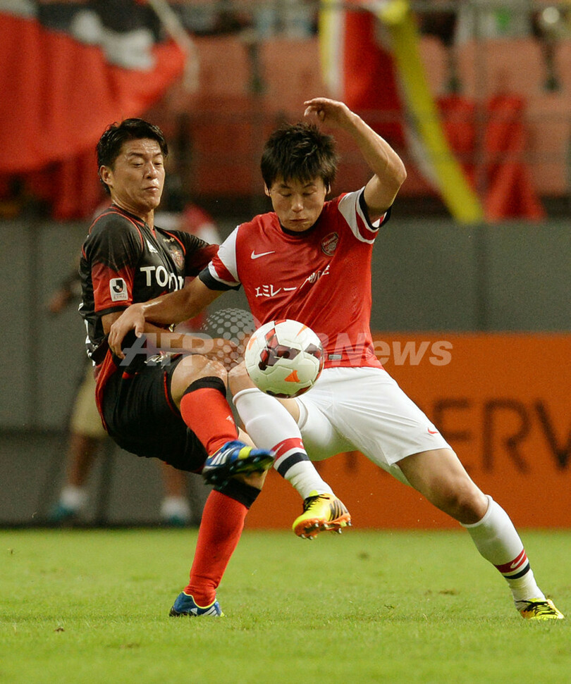 名古屋グランパスの田中隼磨(Hayuma Tanaka、左)とボールを競るアーセナルの宮市亮(Ryo Miyaihci、2013年7月22日撮影)。(c)AFP/TOSHIFUMI KITAMURA