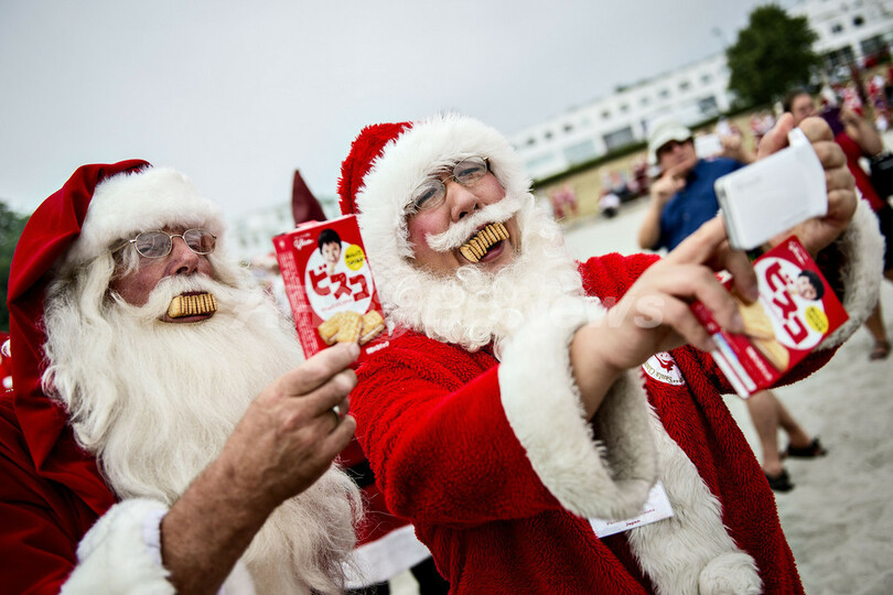 写真は、ビスケットをほおばりながら写真を撮り合うサンタたち(2013年7月22日撮影)。(c)AFP/SCANPIX DENMARK/TORKIL ADSERSEN