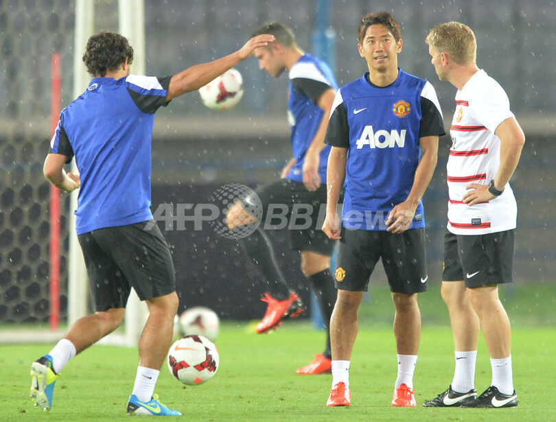 トレーニング中に言葉を交わすマンチェスター・ユナイテッドのデビッド・モイーズ(David Moyes)監督(左)と香川真司(Shinji Kagawa、2013年7月22日撮影)。(c)AFP/KAZUHIRO NOGI