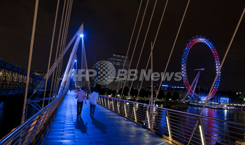 【7月23日 AFP】英ロンドン(London)で22日、将来の英国王となる、ウィリアム英王子(Prince William)とキャサリン妃(Catherine, Duchess of Cambridge)夫妻の長男の誕生を祝って、大観覧車のロンドン・アイ(London Eye)とゴールデン・ジュビリー・ブリッジ(Golden Jubilee Bridges)がライトアップされた。(c)AFP