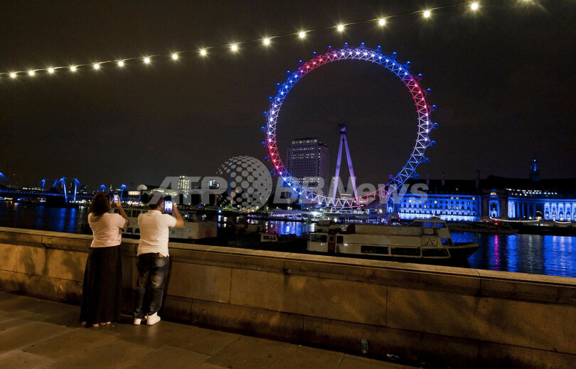 【7月23日 AFP】英ロンドン(London)で22日、将来の英国王となる、ウィリアム英王子(Prince William)とキャサリン妃(Catherine, Duchess of Cambridge)夫妻の長男の誕生を祝って、大観覧車のロンドン・アイ(London Eye)とゴールデン・ジュビリー・ブリッジ(Golden Jubilee Bridges)がライトアップされた。(c)AFP