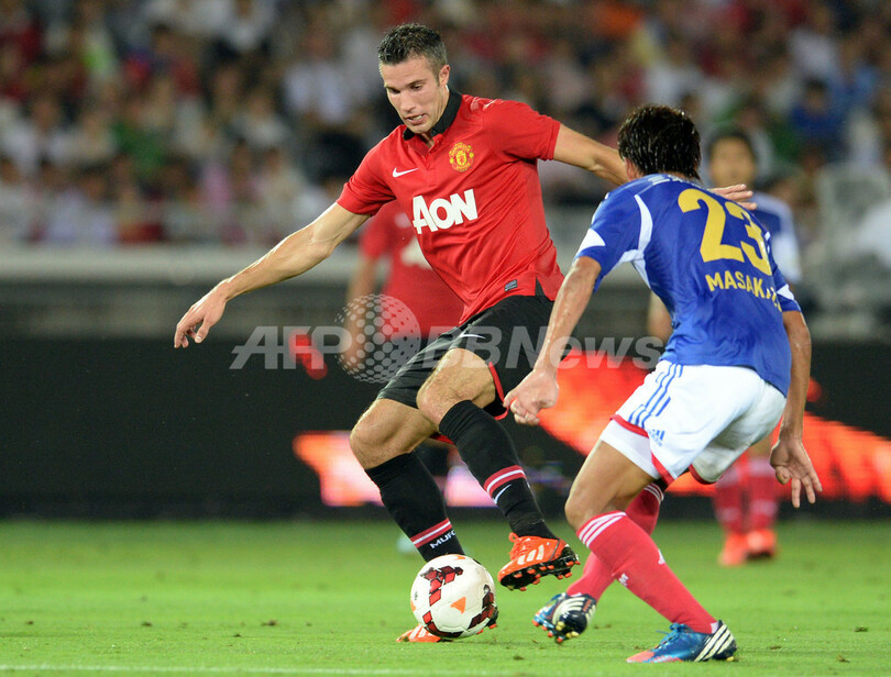 横浜F・マリノスの田代真一(Masakazu Tashiro)とボールを競るマンチェスター・ユナイテッドのロビン・ファン・ペルシー(Robin Van Persie、2013年7月23日撮影)。(c)AFP/TOSHIFUMI KITAMURA