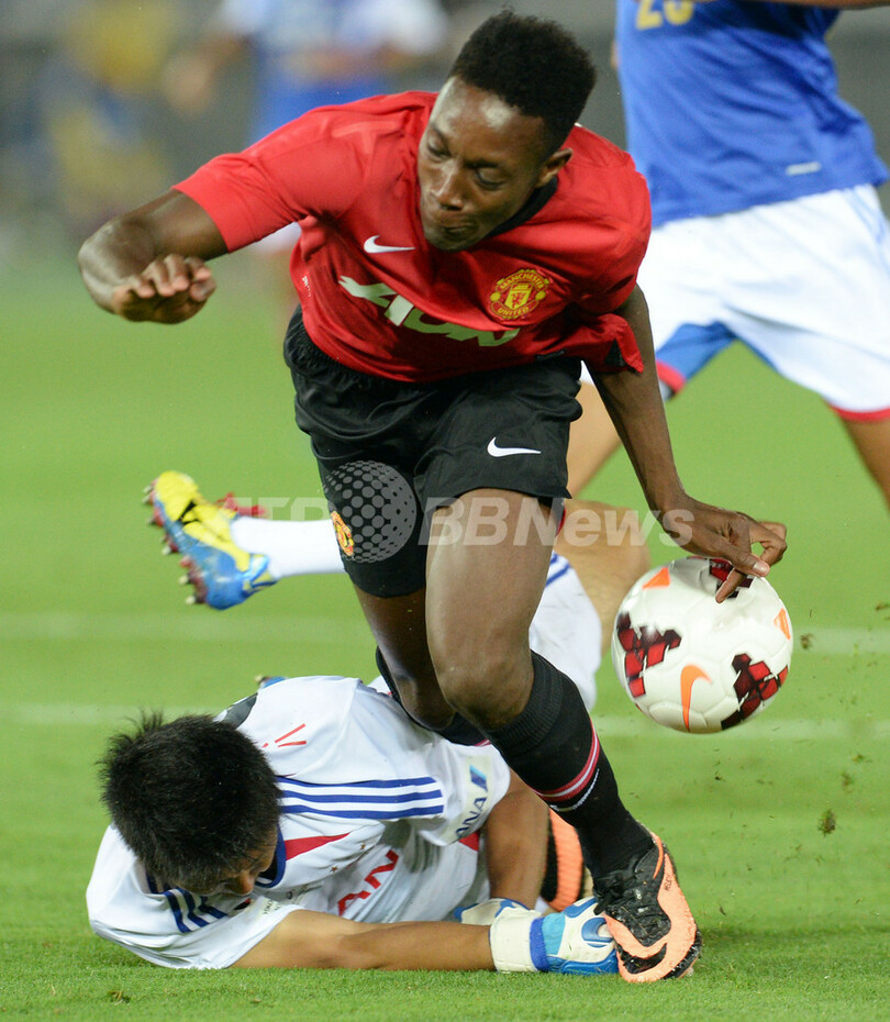 横浜F・マリノスの六反勇治(Yuji Rokutan)に得点機を阻まれるマンチェスター・ユナイテッドのダニー・ウェルベック(Danny Welbeck、2013年7月23日撮影)。(c)AFP/TOSHIFUMI KITAMURA