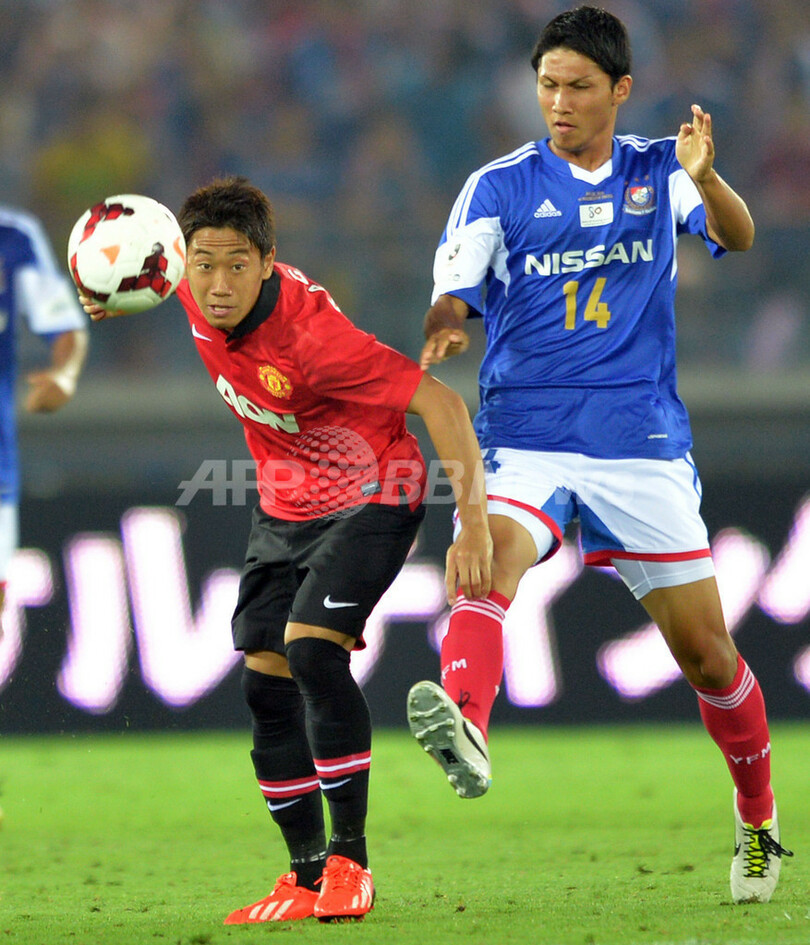 横浜F・マリノスの熊谷アンドリュー(Andrew Kumagai)とボールを競るマンチェスター・ユナイテッドの香川真司(Shinji Kagawa、2013年7月23日撮影)。(c)AFP/KAZUHIRO NOGI