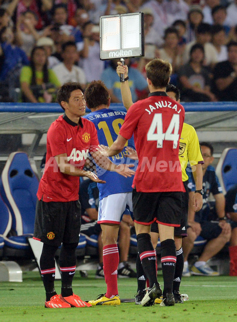 アドナン・ヤヌセイ(Adnan Januzaj)との交代で出場するマンチェスター・ユナイテッドの香川真司(Shinji Kagawa、2013年7月23日撮影)。(c)AFP/TOSHIFUMI KITAMURA