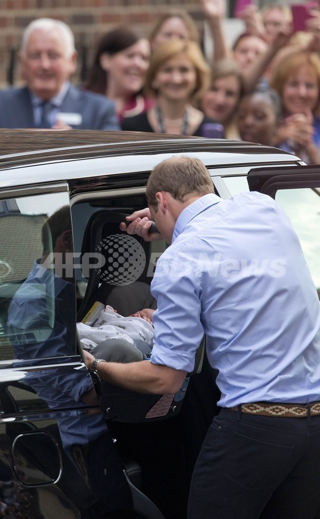 ウィリアム王子はその後、病院前に停められた車の後部座席に、長男を乗せたベビーシートを固定すると、自ら運転し、家族そろって自邸のケンジントン宮殿(Kensington Palace)への帰路に就いた。(c)AFP/Danny KEMP, Katy Lee