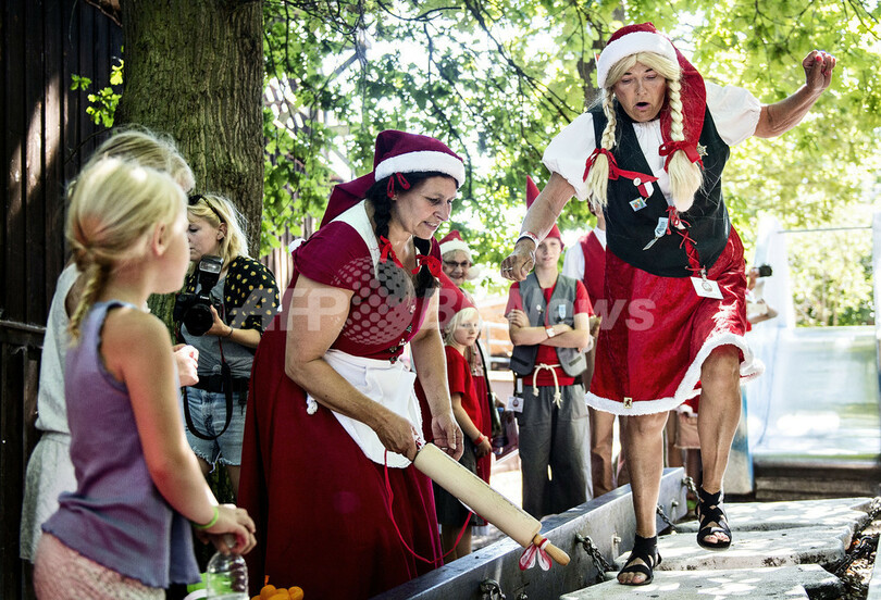 【7月24日 AFP】デンマークの首都コペンハーゲン(Copenhagen)から北へ10kmほどにあるバッケン(Bakken)遊園地で、毎年恒例の世界サンタクロース会議(Santa Claus World Congress)が開催されている。2日目を迎えた23日には、デンマーク出身のサンタと海外からやって来たサンタが、それぞれのチームに分かれて「型破りな」5種競技に臨んだ。結果は海外チームが36-25のスコアでデンマークチームを下した。(c)AFP
