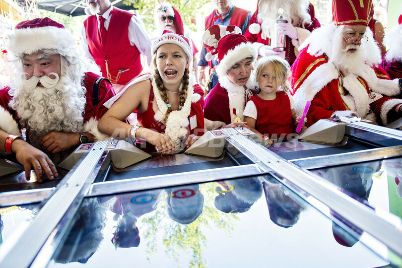 【7月24日 AFP】デンマークの首都コペンハーゲン(Copenhagen)から北へ10kmほどにあるバッケン(Bakken)遊園地で、毎年恒例の世界サンタクロース会議(Santa Claus World Congress)が開催されている。2日目を迎えた23日には、デンマーク出身のサンタと海外からやって来たサンタが、それぞれのチームに分かれて「型破りな」5種競技に臨んだ。結果は海外チームが36-25のスコアでデンマークチームを下した。(c)AFP