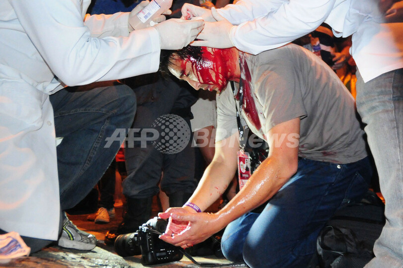 この日のデモではこのほか、ブラジルの日刊紙グロボ(O Globo)のカメラマンも頭に投石を受けて負傷した。誰が石を投げたのかは分かっていない。(c)AFP