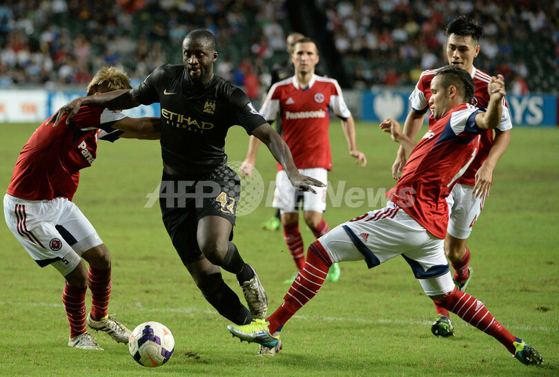 相手選手に囲まれるマンチェスター・シティのヤヤ・トゥーレ(Yaya Toure、2013年7月24日撮影)。(c)AFP/Dale de la Rey