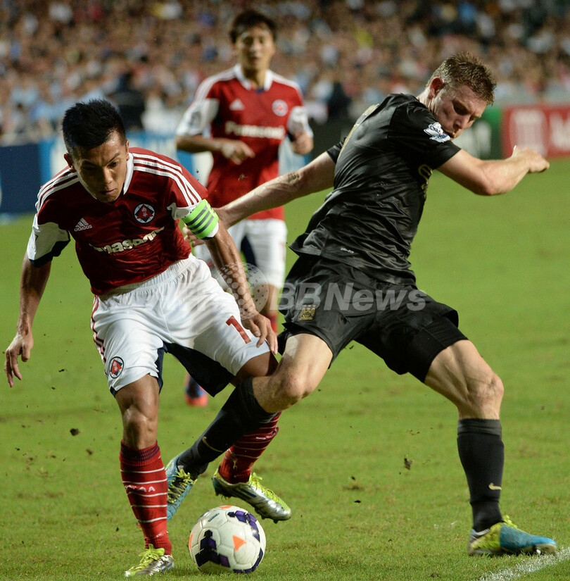南華足球隊の郭建邦(Kwok Kin Pong、左)とボールを競るマンチェスター・シティのジェイムス・ミルナー(James Milner、2013年7月24日撮影)。(c)AFP/Dale de la Rey