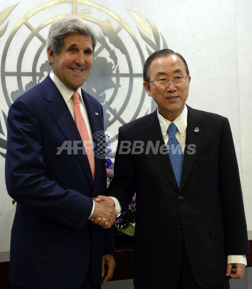 潘事務総長は、「これ(シリア内戦)に終止符を打たなければいけない。全当事者は軍事行動や暴力行為を停止すべきであり、ジュネーブ(Geneva)での平和会議をできるだけ早く開催することが不可欠だ」と発言。ジョン・ケリー(John Kerry)米国務長官と共に記者団に対し、28か月にわたり続くシリア内戦に対する軍事的な解決法は存在しないとの見解を表明した。(c)AFP