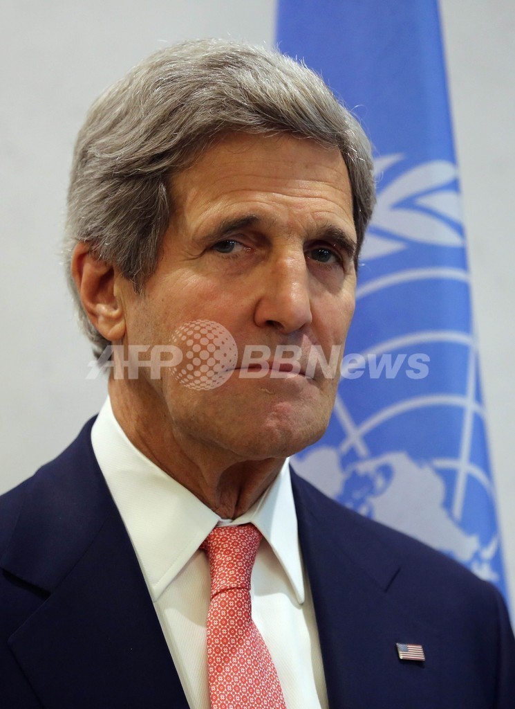 潘事務総長は、「これ(シリア内戦)に終止符を打たなければいけない。全当事者は軍事行動や暴力行為を停止すべきであり、ジュネーブ(Geneva)での平和会議をできるだけ早く開催することが不可欠だ」と発言。ジョン・ケリー(John Kerry)米国務長官と共に記者団に対し、28か月にわたり続くシリア内戦に対する軍事的な解決法は存在しないとの見解を表明した。(c)AFP