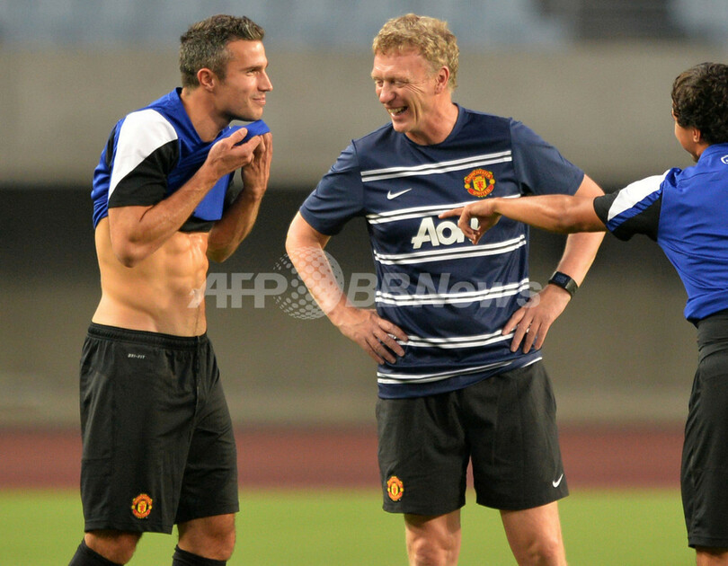 練習に臨むデビッド・モイーズ(David Moyes)監督とロビン・ファン・ペルシー(Robin Van Persie、2013年7月25日撮影)。(c)AFP/KAZUHIRO NOGI
